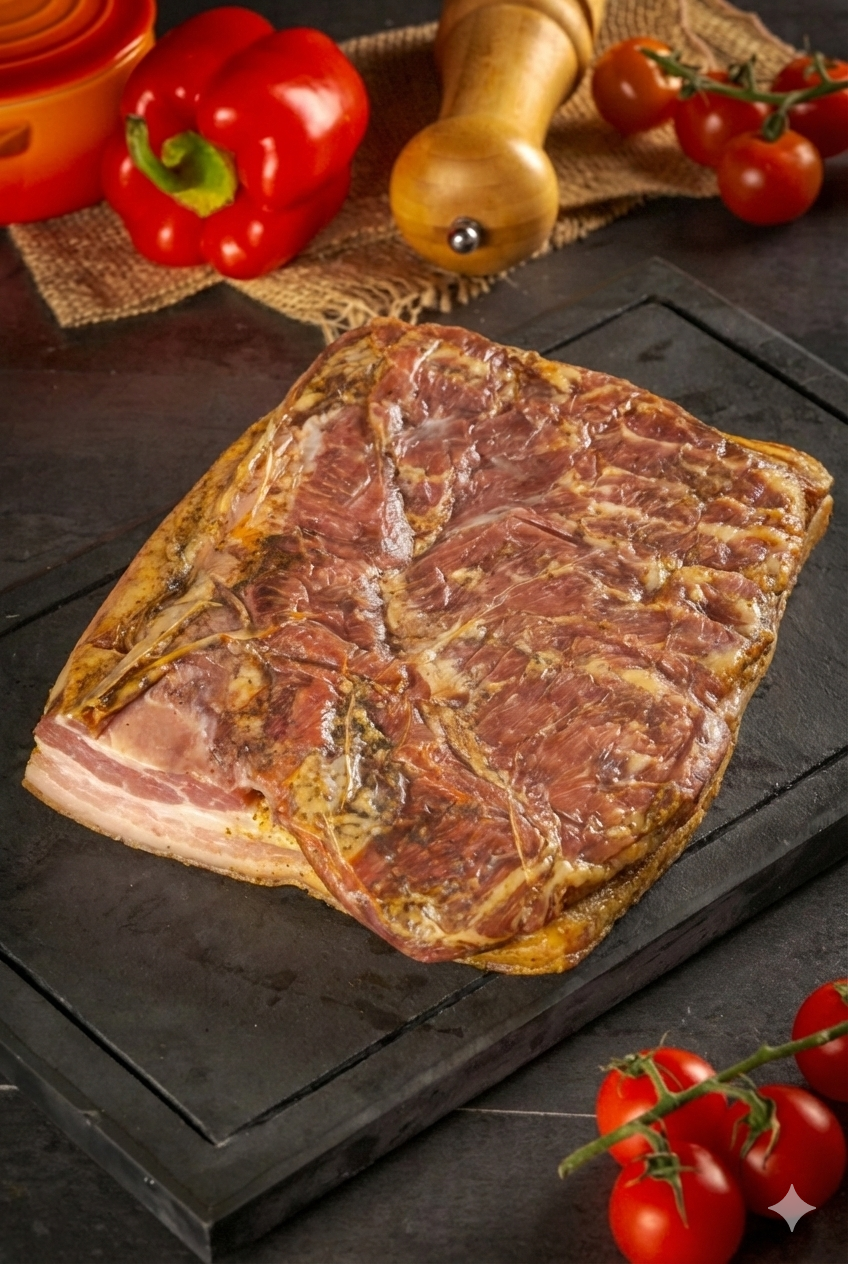 Ingredientes: Barriga suína selecionada, sal, pimenta do reino e páprica defumada, antioxidante e conservante INS250 e antioxidante 316.