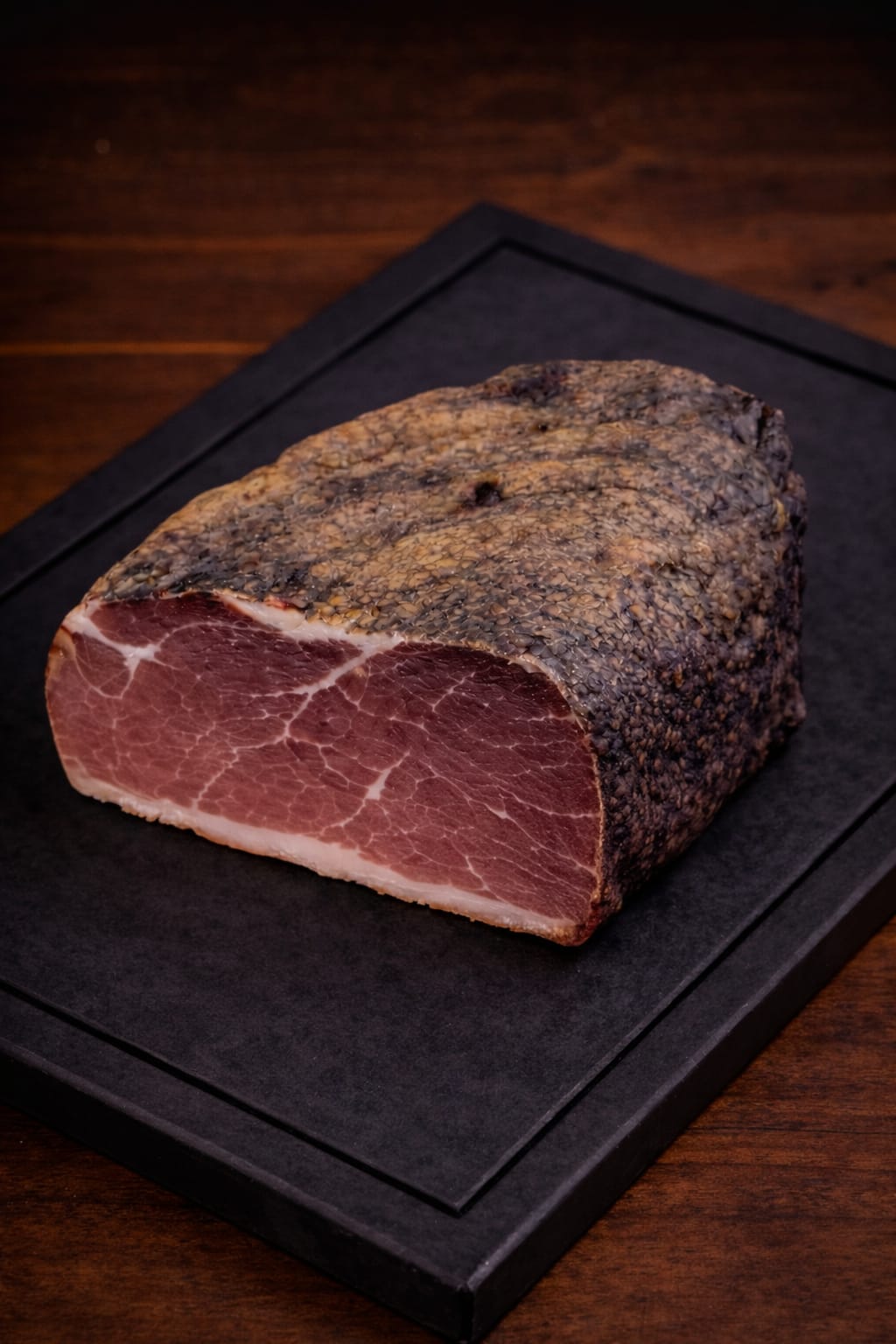 O Presunto Cru Rústico segue a tradicional receita italiana com um sabor incomparável e feito artesanalmente, condimentada com sal, pimenta e outras ervas aromáticas massageadas à mão. É elaborado com o pernil e passa por uma maturação lenta de 120 a 150 dias em nossa câmara climatizada perdendo umidade para concentrar ainda mais o sabor e adquirir a textura característica. Pode ser usado tanto para entradas, aperitivos, bruschettas, tapas, lanches e até para receitas mais sofisticadas e harmoniza com vinho tinto e queijos.